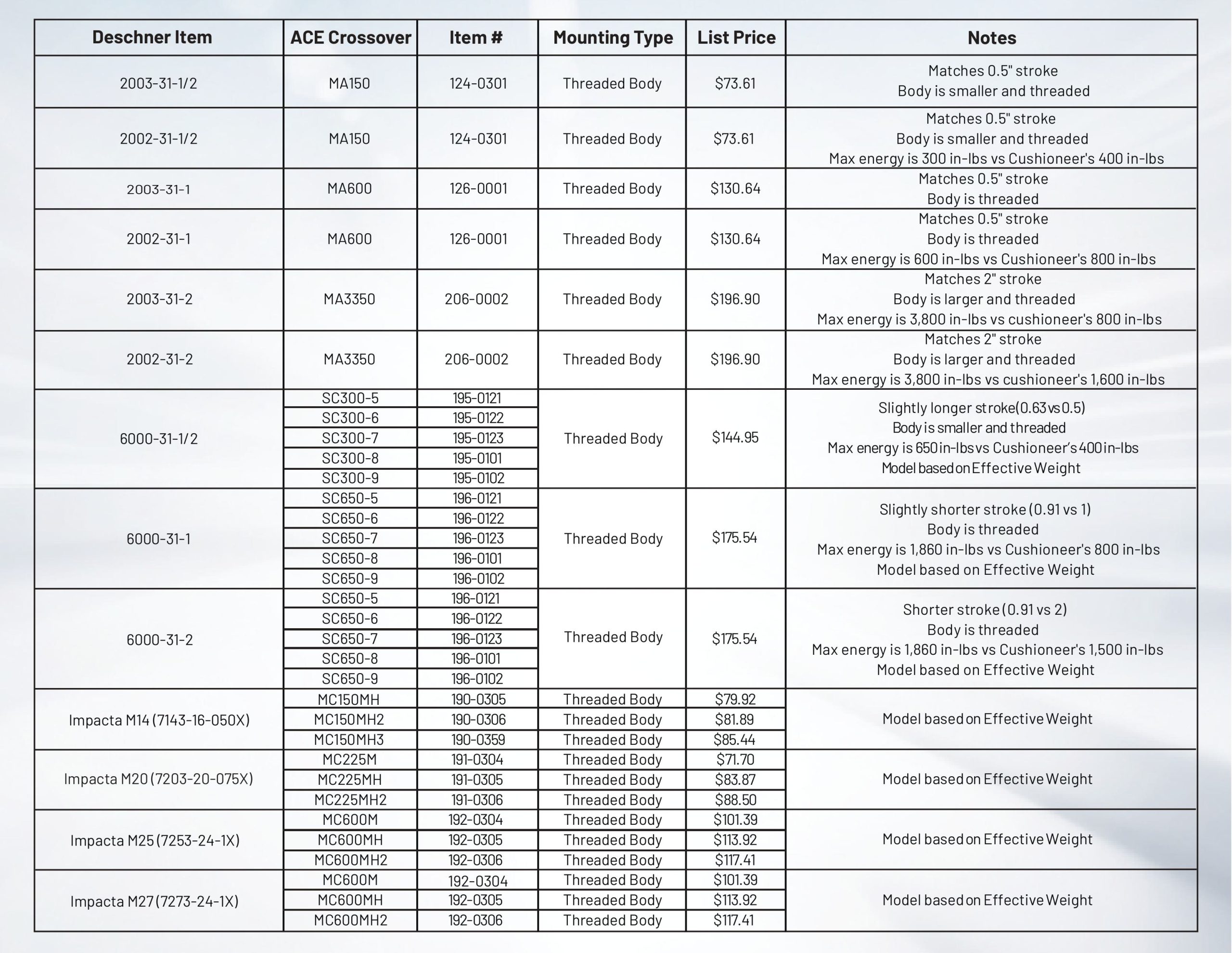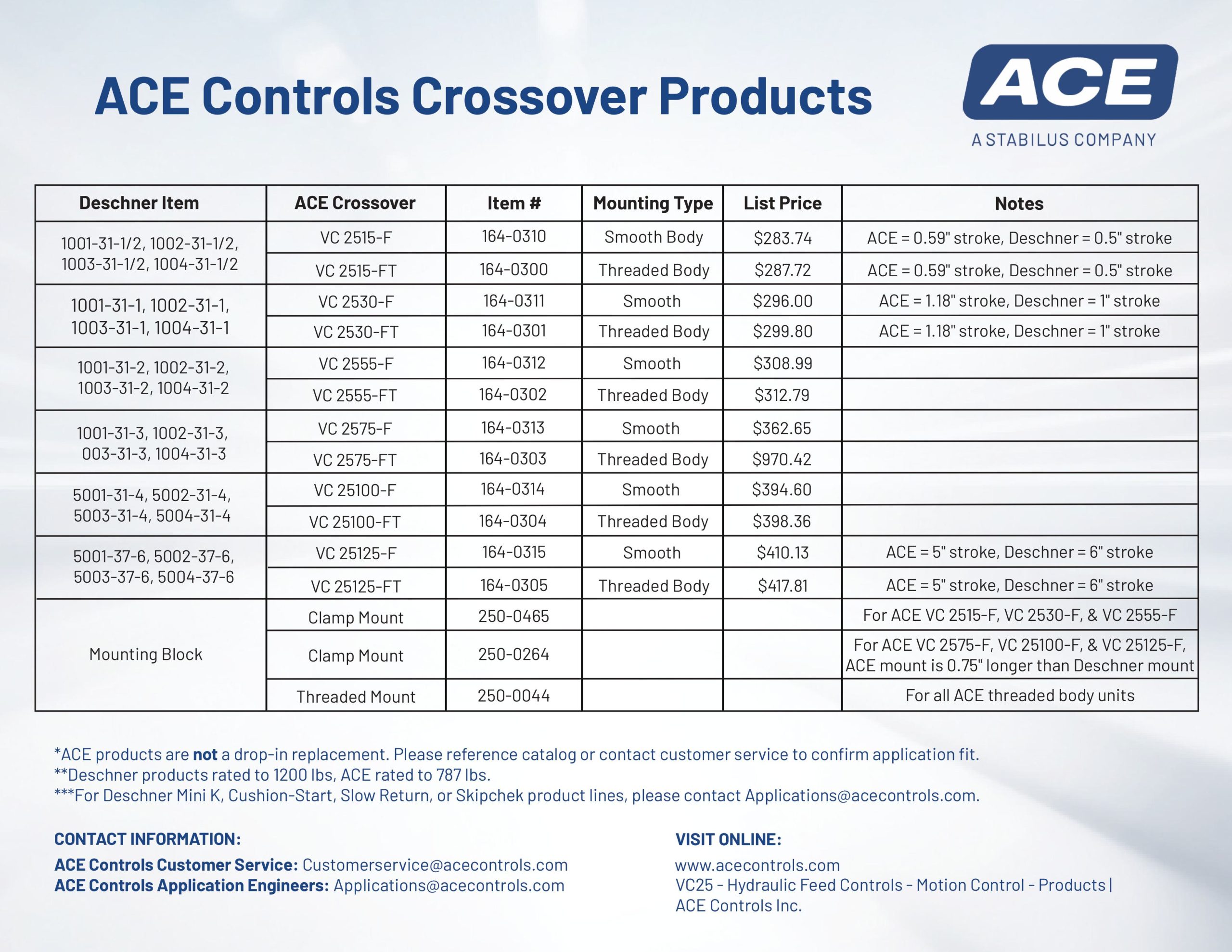 ACE Controls offers direct or near-direct equivalents for many popular Deschner models. In several cases, ACE replacements provide improved performance or longer life.